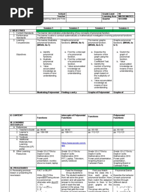 Grade 10 Daily Lesson Log School Grade Level 10 Teacher Learning Area Mathematics Quarter Second Pdf Zero Of A Function Polynomial