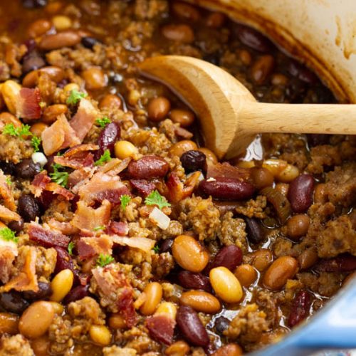 Stovetop Bourbon Bacon And Sausage Baked Beans Call Me Pmc